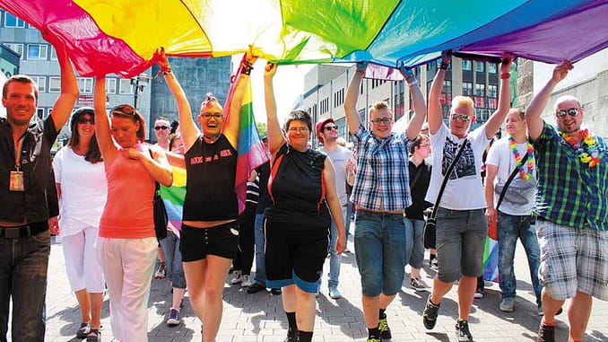 Regenbogenfahnen umsäumt sein und über 20 Infostände von Gruppen und